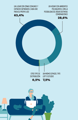 Un 63,4% de jóvenes se decantan por la opción más tradicional con una clara delimitación entre zonas comunes y habitaciones, un 28,6% optan por un hogar con ambientes polivalentes mientras que un 7,5% eligen una vivienda tipo loft o estudio.