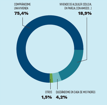 Un 75,4% de los jóvenes encuestados se ve comprando una vivienda a futuro y solo un 18,9% apuesta por el alquiler. A mucha distancia aparecen los jóvenes que en unos años todavía se imaginan viviendo con sus padres (4,2%).